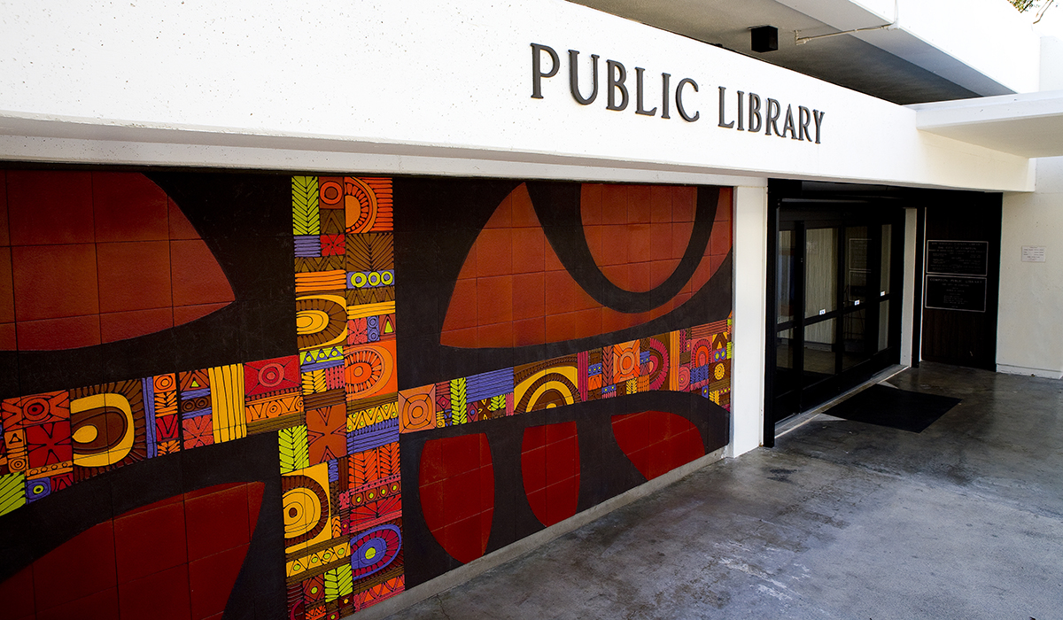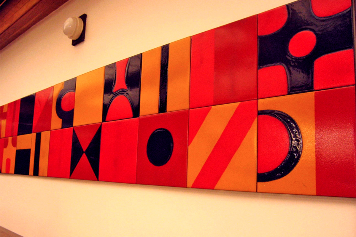 This long ceramic tile mural, commissioned in 1977, lines the Lynwood Library’s east wall. It is composed of two rows of square tiles each featuring a different geometric design and glazed in four colors: red, orange, yellow, and black. Stretching the length of the wall, the band of tiles is playfully interrupted by doorways and alcoves. The mural’s colors combined with its shapes suggest historic Spanish and native California motifs.