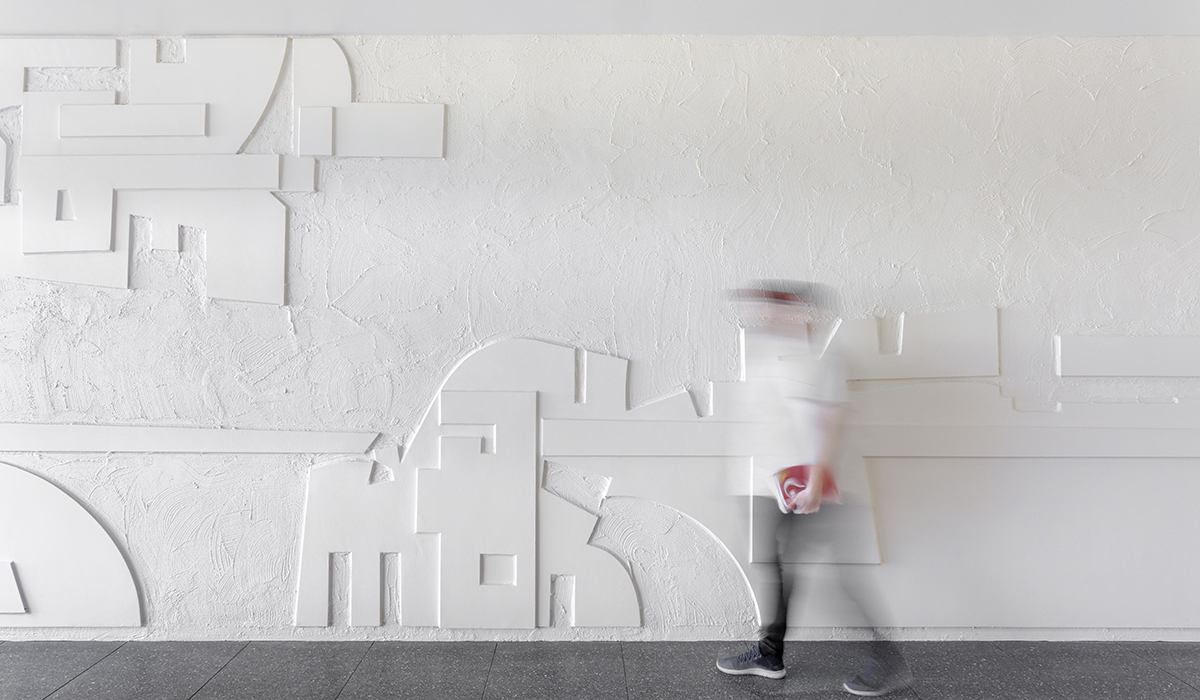 Dora De Larios created this plaster veneer bas-relief mural for the Rowland Heights Library when it was being constructed in 1978. The artwork fills an entire wall in the library’s foyer with an abstract composition of geometric shapes that rise from the floor and descend from the ceiling. Dora De Larios cut all of the mural’s plaster forms and then attached them to the wall. A master plasterer, hired by De Larios, finished the texture of the surface shapes with a steel trowel and used a brush broom for the mural’s background.