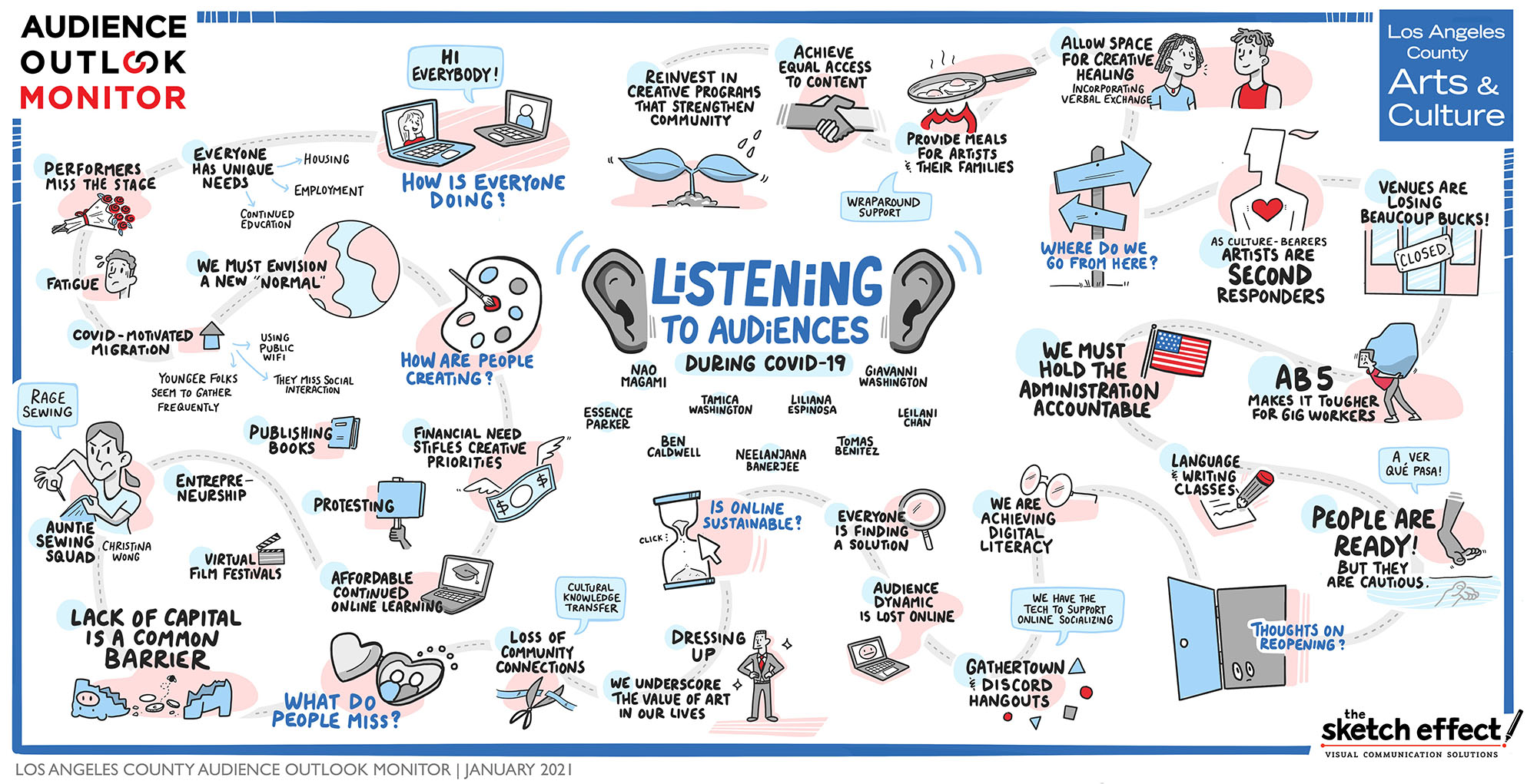 In order to deepen our understanding of LA County residents’ needs and experiences of arts and culture during the pandemic, a qualitative study component was added. Ten grantee representatives conducted in-depth interviews with audience members, students, artists and staff. In the interviews, they asked about current arts and culture experiences and activities, online engagement with arts and culture, and recommendations for local arts and culture organizations.