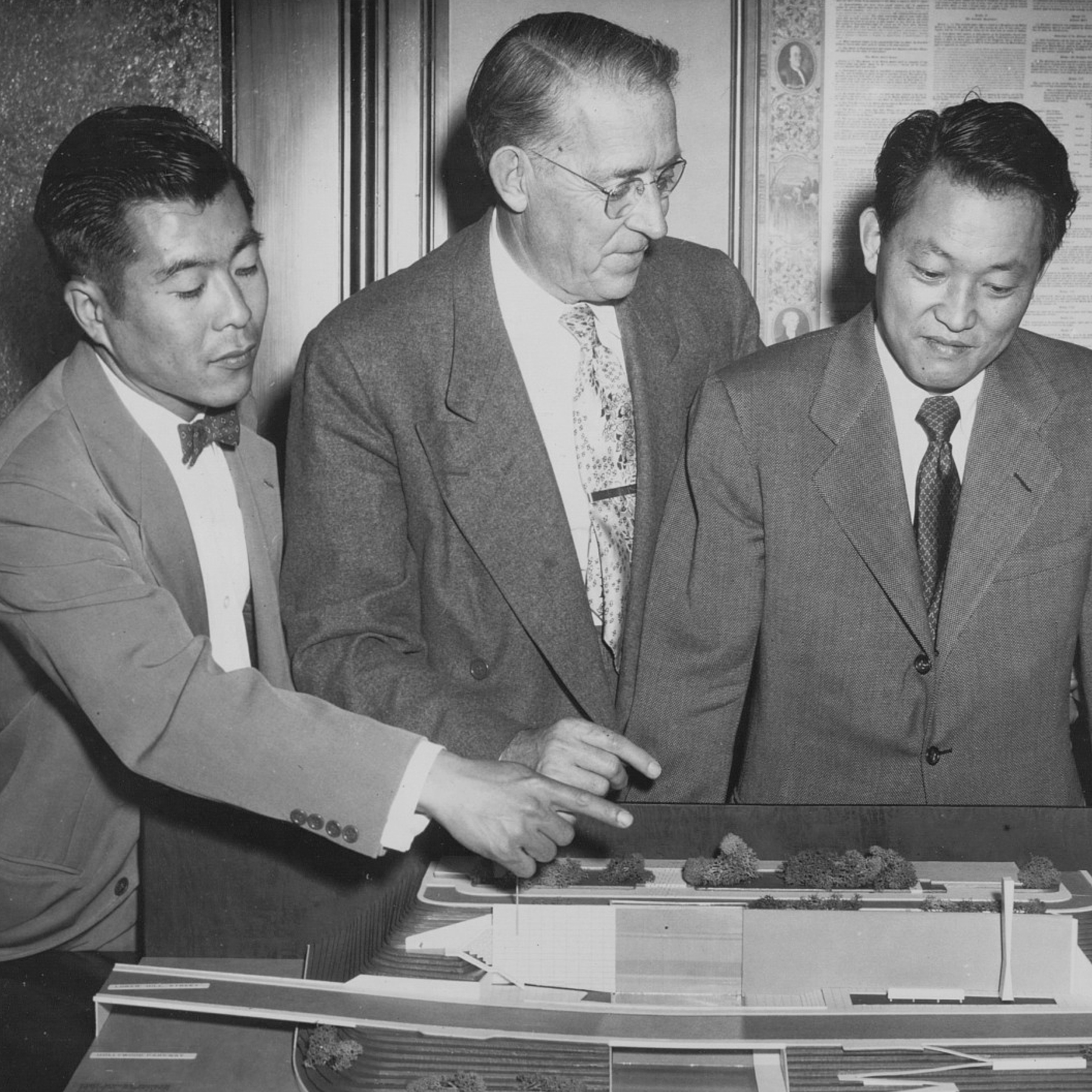 But before construction could begin, the Fort Moore Pioneer Memorial Advisory Committee (composed of influential Angelinos, including Dorothy Chandler and John Anson Ford) held an architectural competition to choose a design for the Memorial. The Committee received 77 entries to the competition, eventually choosing Kazumi Adachi and Daisuke Dike Nagano of Los Angeles. Construction on the project began on June 23, 1953.