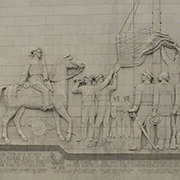 A Connecticut-based, German-born sculptor, Henry Kreis (1899 - 1963) designed the most notable feature of the monument: the large terra-cotta memorial wall. Kreis’s stylized design depicts American troops raising the flag, and a series of flanking vignettes show regional scenes of orange groves, cattle ranching, and water and power systems. Kreis’s panels were fabricated by Gladding McBean who have produced a number of architectural terra-cotta works throughout Los Angeles and Southern California since the 1930s.