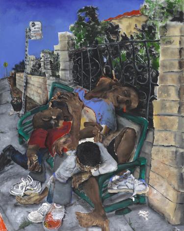 This painting brings attention to people who are experiencing homelessness within Los Angeles/Los Angeles County. All races and groups of people are faced with becoming homeless today, but racial minorities experience this significantly more than White people. African Americans, in fact, make up more than 40 percent of the homeless population in the US. Unfortunately, there are countless reasons for one to experience homelessness, however most racial hindrance and disparity are rooted in past racial/social policies that have designed educational, housing, health, and economic barriers for people of color. The figures in this piece represent the increasing population of homelessness within Los Angeles. They are struggling for room on the bench of the bus stop; treating the bench as a bed or temporary place of rest. The advertisement hidden behind them on the bench reveals a face reminiscent of those who were behind these placed policies.