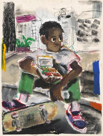 Boy Sitting Down Eating After Skating, 2022, Oil pastel, acrylic, charcoal on paper