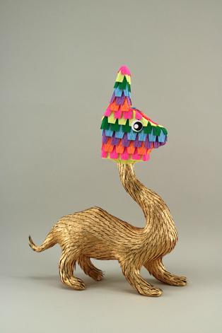 In his Illuminated Hybrid series, artist Roberto Benavidez blends traditional piñata animal forms with fantastical creatures from the marginalia of medieval manuscripts to create new creatures and celebrate the visual harmony that can be found between cultures. Building on the belief that representation in art matters, the artist’s Mexican American identity often influences his work. For the past fourteen years, Benavidez’s sculptural practice has specifically centered around the piñata and how its multi-cultural origins reflect his own mixed-race identity, using the concept of mixing, at times hybridizing, two motifs: Western art and Mexican piñata craft.