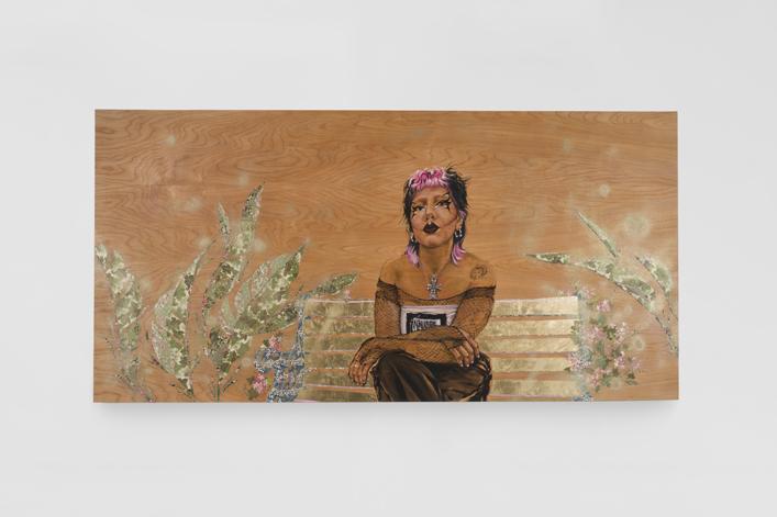 Mina with Palms, 2022, Oil, washi paper, glitter, spray paint, metal leaf on wood panel