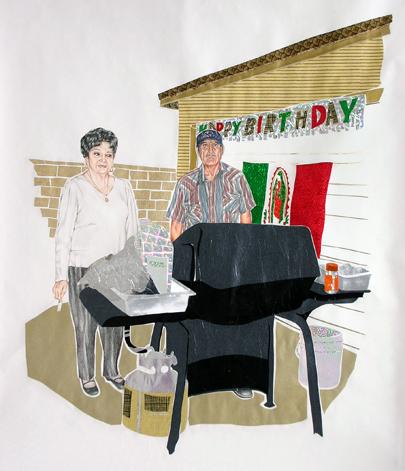 This artwork is a portrait of Rogelio and Carmelita Soto at their daughter Angie's birthday BBQ party. This piece speaks to the backyard parties and Mexican American identity that inhabits the Southlands of Los Angeles