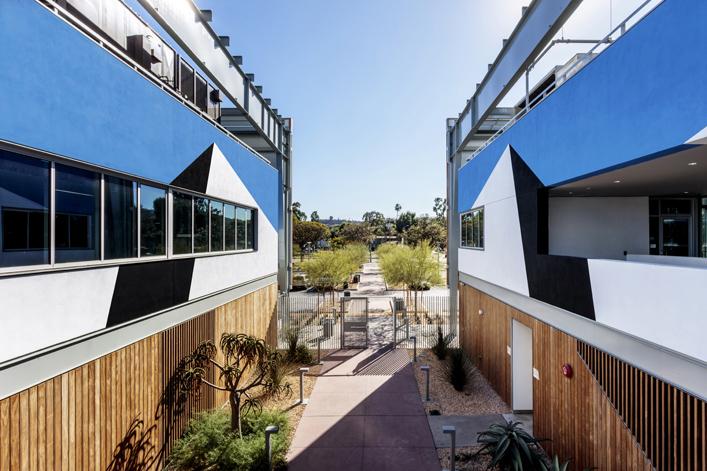 The artist’s work draws inspiration from the landscape of the city–the view of the mountain ranges, the light and shadows shifting throughout the day, and the bright blue sky that illuminates Los Angeles. When walking between the two facing murals, Chin intends the viewer to feel and amplify the movement inherent throughout the Michelle and Barack Obama Sports Complex. These two murals are an invitation to see beyond what is, to celebrate the vibrancy and energy of the Complex, and the Crenshaw neighborhood and community.