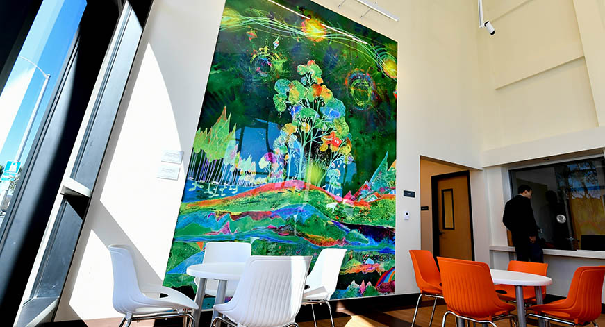 The lobby of this new Wellness Center features three brand-new additions to the County Collection by artist Christine Nguyen. The artworks, Mystical Forest—a 16' tall photo-based mural, Magical Deer—a mural that also functions as a dividing wall between the children's waiting area and the adult's, and Portal's Eye—a hanging acrylic chandelier—are inspired by the flora and fauna of the surrounding San Fernando area. They are designed to cultivate a playful and imaginative atmosphere that the artist hopes will create a sense of wonder for clients, visitors, and staff alike.