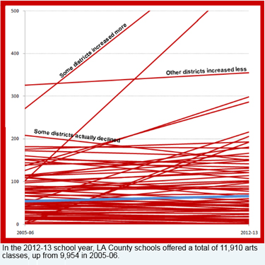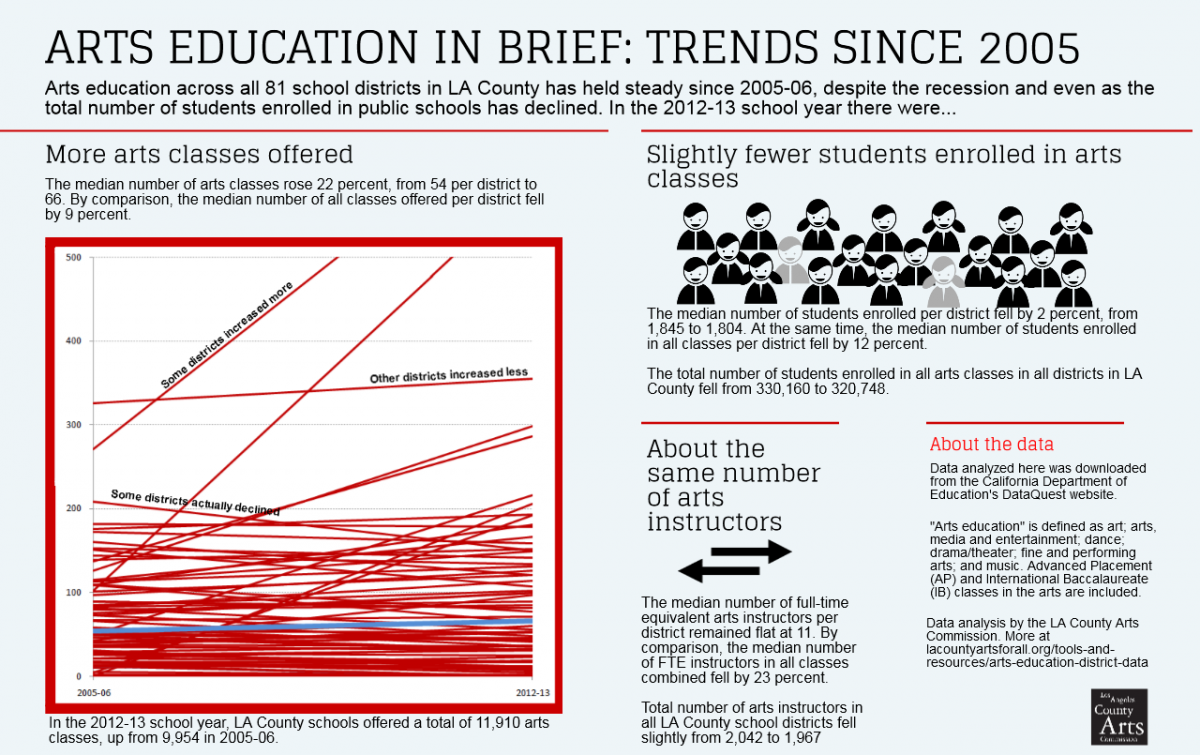 Arts education across all 81 school districts in LA County has held steady since 2005/06, despite the recession and even as the total number of students enrolled in public schools has declined.