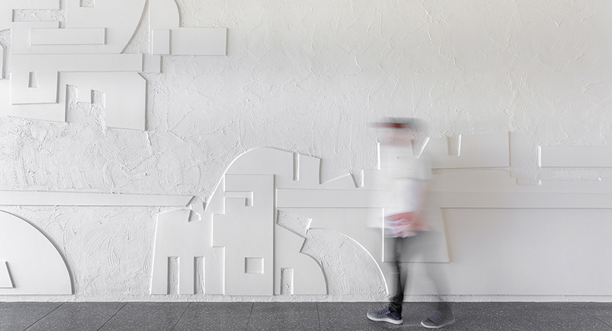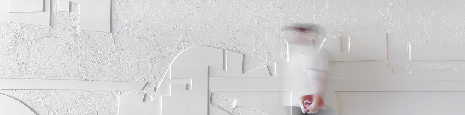 Dora De Larios created this plaster veneer bas-relief mural for the Rowland Heights Library when it was being constructed in 1978. The artwork fills an entire wall in the library’s foyer with an abstract composition of geometric shapes that rise from the floor and descend from the ceiling. Dora De Larios cut all of the mural’s plaster forms and then attached them to the wall. A master plasterer, hired by De Larios, finished the texture of the surface shapes with a steel trowel and used a brush broom for the mural’s background.