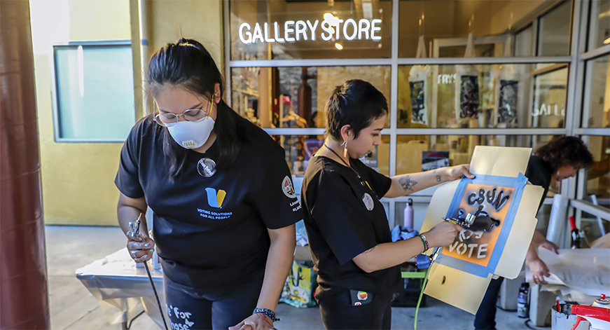 (Above) CSUN students create artwork as part of a voter engagement activity facilitated by Creative Strategist and artist Deborah Aschheim in collaboration with the Registrar-Recorder to raise awareness about their new Voting Systems for all People. Photo by Monica Almeida.