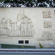 Located on North Hill St. in Downtown Los Angeles, the Fort Moore Pioneer Memorial depicts the ceremonial flag being raised over the historic fort on July 4, 1847.