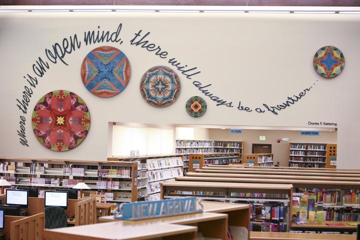 Anne Marie Karlsen’s series of large porcelain enamel patterned discs are composed from local photographic imagery. The designs appear abstract from a distance, but up close you can see the history of the community. “The repetitive circular motif in the artwork is loosely inspired by the image of old western wagon wheels. The wheels spin ‘round and round’ across the wall as if moving into the future. The photomontage in each wheel is a kaleidoscopic repeat of both historic and contemporary photos that depict the Acton/Agua Dulce community. The artwork incorporates photographs of the area’s history and reconfigures these images to create a dynamic future view. The artwork and the quotation refer to the pioneer roots of the community. The quotation connects the frontier spirit of the community with the open frontier of knowledge. The library is that new frontier, where open minds can push the boundaries, the edges, of learning, imagination and understanding.”