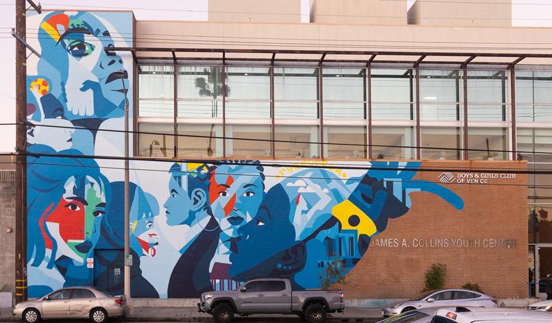 Artist team, Aqmni collaborated with the members of the Boys and Girls Club of Venice to conceptualize and fabricate this mural for their building in 2022. The design celebrates the diversity of the youth served by the club and the unique access to the arts it specializes in providing. At first glance, the design appears chaotic but upon closer inspection, the lines and colors coalesce in perfect harmony. Although this composition was intended to be symbolic of the essence of the Venice location Boys and Girls Club, the artists feel it is also further reflective of the synergistic and diverse landscape of Los Angeles.