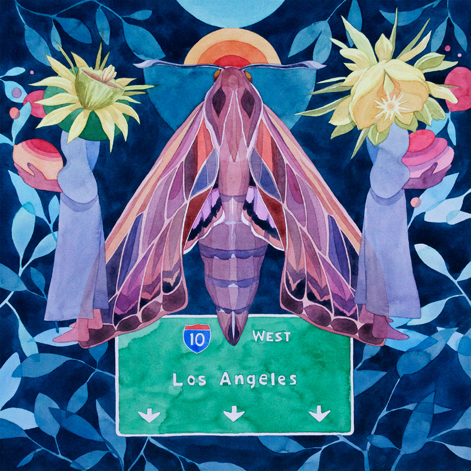 This painting is inspired by urban ecological relationships among the landscapes of the Los Angeles Basin. At the same time, it is a personal examination of my sense of place in Los Angeles, my interactions and memories of the land, and how I relate to the identity tied to this locale. The image references the nocturnal White Lined Sphinx Moth, which pollinates the Cereus Night Blooming Cactus.