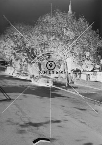 This body of work pinpoints specific sites (or sights) tied to marginalized Brown communities and seeks to invert the colonizer’s vision in which land is seen as empty. The photographic prints depict present-day addresses in LA which appeared on eviction notices issued to three predominantly Mexican neighborhoods during the 1950’s, later displaced to make way for the construction of Dodger Stadium. The black charcoal drawn images, which erase parts of the photographic print, are derived from Filipino amulets known as “anting-anting.” These amulets were part of essential Filipino battle gear as they were believed to give the Filipinos magical powers against the Spanish colonizers.
