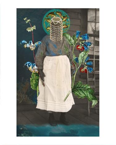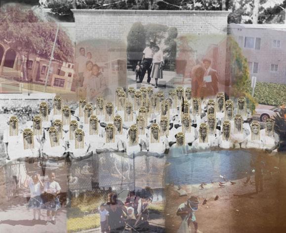 The Great Maternal Migration is a digital collage comprised of an archival photo of Black midwives in the South and photos of the artist’s family in Los Angeles. Bonaparte’s maternal grandparents are at the top of the image, surrounded by their children and relatives on both sides. At the bottom of the image are photos of Bonaparte with her mother and siblings, consisting of backgrounds of the neighborhood streets where she lived; feeding birds in Echo Park; the first day of school at Fletcher Drive elementary; and an outing at La Brea Tar Pits. The midwives are shrouded in cowrie shells to elevate them as ancestor midwives and show a lineage of midwifery practices that the artist’s family is returning to.