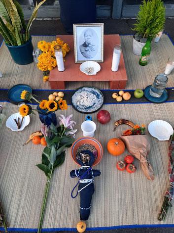 The Biddy Mason Community Altar depicts a community altar built in honor of Los Angeles grand midwife, Biddy Mason. The artwork was part of the Black Sanctity & Trust exhibition, to bring awareness and healing to the Black body through traditional Black midwifery care. A basic altar was constructed with a few candles, a photograph of Biddy Mason, a mat, and a platform. The community of participants coming from different parts of the city, including Black birth workers, were invited to contribute to the building of this site-specific, Los Angeles altar.