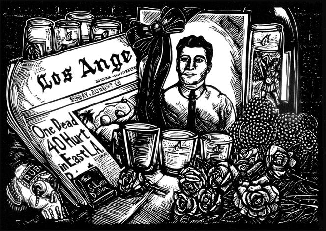 Rubén Salazar was the first journalist from main-stream media to report on the Chicano community. His photograph sits among mementos that make up an altar tribute to his life. He was killed by a shot in the head from a tear gas canister by a deputy of the Los Angeles County Sheriff's Department. He was shot while he sat at the Silver Dollar Bar in East L.A., taking a break from covering the Chicano Moratorium, a protest against the disproportionate number of Chicanos being drafted into the war.