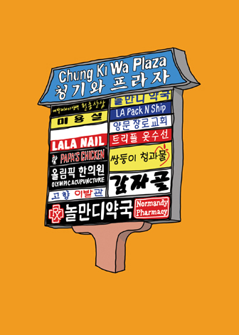 Dusty strip mall signs in Koreatown, often overlooked by outsiders, signify a vibrant community thriving under the radar of Greater Los Angeles. The signs, written in Korean, call out to those who search for a taste of something familiar from their memories of a home long gone, like a haircut from a hometown barber or pork potato stew just like how your umma used to make.