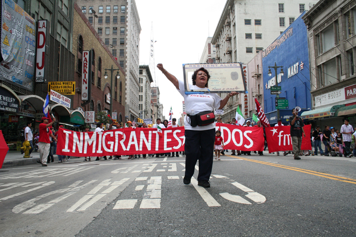 This photograph was taken in Downtown Los Angeles during the second of a series of historic marches for U.S. immigration reform in 2006. The march was part of the largest nationwide day of protest for U.S. immigration reform, as marches and rallies occurred in 102 cities across the country. Pictured is a protester proudly wearing an enlarged replica of a U.S. green card (known officially as a permanent resident card), as she leads a portion of the march. Creativity was a signature trait of the marches that occurred that year.