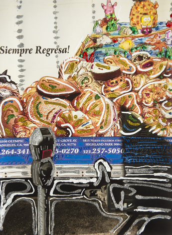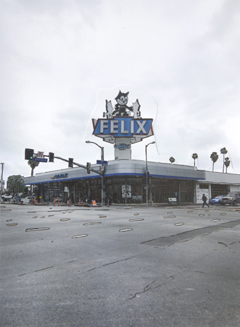 Going West: Figueroa St. and Jefferson St. depicts the Felix Car dealership, which is located directly across from the University of Southern California, where I went as an undergraduate student The image is marked on, as parts of the photo have been highlighted, duplicated, graffitied, and whited out. While the sign for the dealership is still intact, the dealership itself no longer exists. For me, this image has become a marker of an ever-shifting city, affected by gentrification, development and ever continuous cultural change.