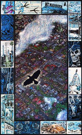As the Crow Flies shows an aerial view of Northeast Los Angeles, framed by painted tiles highlighting historical and contemporary aspects of a vibrant and ever-changing community. Included are the statues from the entrance of L.A.'s first zoo in Lincoln Park, a window from the Breed Street Shul, the Evergreen Cemetery, a reference to Mount Washington's Self-Realization Fellowship, as well as more contemporary references like Avenue 50 Studio and Chicken Boy.