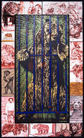 At the center of the work is a rendering of Monarch, the last California Grizzly Bear in captivity, who died at the San Francisco Zoo in 1911. Surrounding Monarch are painted tiles with various depictions of some of the things which made life for the California Grizzly unendurable following the arrival of European settlers to California, including bear hunts for meat and bounty and bull and bear contests. Monarch is also shown stuffed and mounted at San Francisco's Academy of Sciences and, of course, is represented in California's state flag.