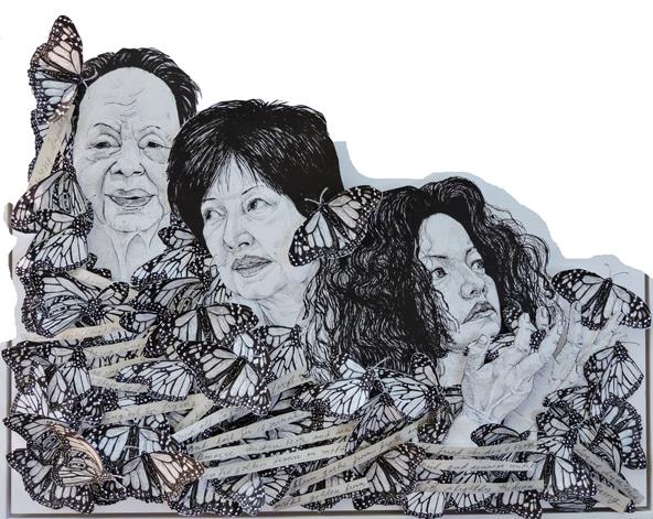 Fractal is a tribute to the self-repeating patterns of motherhood. In this work, I feature my grandmother, my mom and myself, monarch butterflies, and the handwritten recipe of my grandmother's adobo. I come from a family of amazing cooks and for a while there, I thought the cooking gene skipped me. But by the time my second son was born, someone flicked the switch, and I could cook. My grandmother's adobo was the benchmark of my family. Los Angeles is filled with so many cultures and everyone has their own recipe that's traveled with them both in time and place.