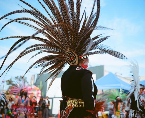 A danzante stands tall during a traditional danza performed for Self Help Graphics annual Día de Los Muertos event. Danza Azteca in Los Angeles has connected generations of Chicanes to their Indigenous roots and this image aims to honor that connection and the culture's immense presence in our city.