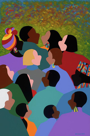 Brand New Day depicts a multicultural grouping of people looking up to a vividly colored sky, symbolizing the promise of a bright new future for all and the creation of cheerful new memories.