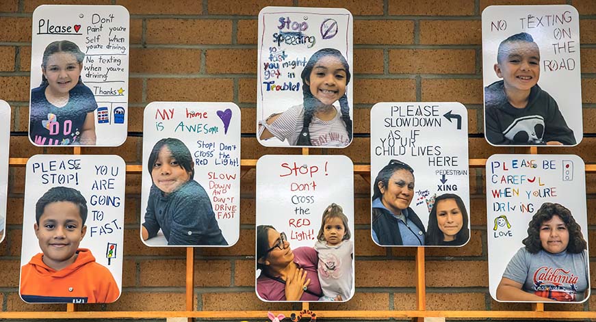 Creative Strategist Clement Hanami has been in residence with the Department of Public Health’s PLACE (Policies for Livable Active Communities and Environments) Division since 2018 working on the Vision Zero Initiative. Vision Zero is a County initiative to reduce traffic fatalities and severe injuries while increasing safe, healthy, and equitable mobility for all. Clement collaborated with County staff and community stakeholder groups to develop artistic interventions, strategies, and engagement plans to raise awareness of traffic safety issues. Through a series of workshops with seniors and youth and their families in the Collision Concentration Corridors (areas in unincorporated LA County with the highest incidences of pedestrian fatalities and injuries) of East Los Angeles, Walnut Park, and Westmont/West Athens, Clement developed temporary and permanent public art works, including a bike rack, billboards, and bus shelter posters. In the workshops, youth and their families created text and imagery for the billboards and bus shelter posters that convey the need for drivers to slow down and watch out for pedestrians. For Clement, it was important for participants to feel that their voices had been heard. He created works using their words and faces and placed them prominently in the neighborhood for all, including dangerous drivers, to see. The billboards and bus shelter posters were placed throughout the Westmont/West Athens neighborhood in October and November 2020.