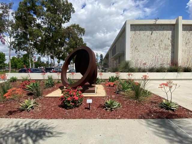 The sculpture was donated by private collector Kevin Burke and installed in April 2021 at the front entrance of the newly renovated Norwalk Library to be enjoyed by all visitors. Benton was an American sculptor who practiced his art in Northern California for most of his career. Folded Circle Ring Interlocking S is an excellent representation of Benton’s large-scale, abstract, kinetic steel sculptures, and a wonderful addition to the Civic Art Collection.