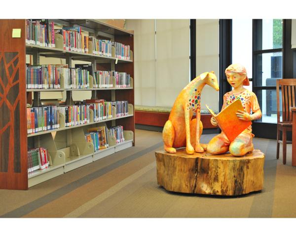 A Great Tale features a boy sitting on a stump and reading to his dog; the stump was recycled from one of the oak trees lost to the construction of the library. The sculpture is made of wire mesh coated in papier maché, reinforced with fiberglass cloth and casting resin and painted in bright acrylic colors.