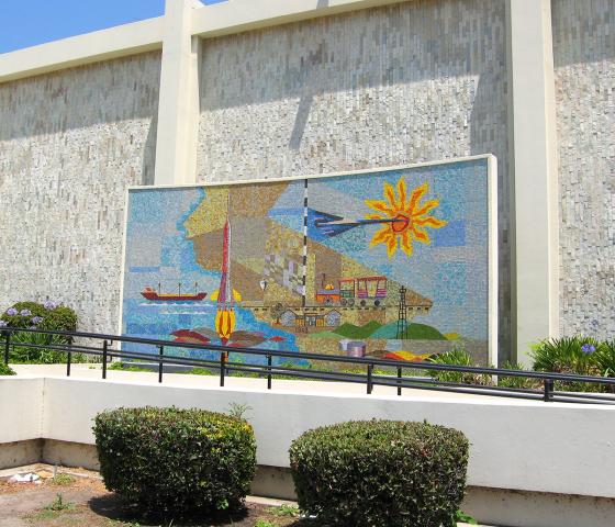 The artwork by Ben Mayer at the Norwalk Library consists of three parts: a circular mosaic in the interior children’s section and two large mosaic murals flanking either side of the main entrance. Outside the library two mosaics depict California’s history and use maps to exemplify changes that have occurred over several hundred years. This mosaic north of the entrance depicts a modern map of the State of California. Placed over the map are images of several industries which helped develop the State. A Mission with an orange tree represents agriculture, a train and a shipping freighter stand in for transportation and trade, and a jet and a rocket represent the aerospace industry.