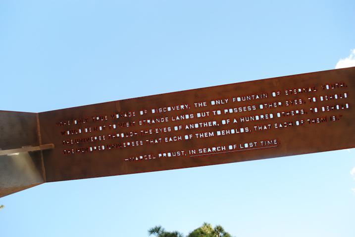 The sculpture contains a quotation by the French author Marcel Proust, with the sky as a backdrop: “The only true voyage of discovery would not be to visit strange lands, but to possess other eyes, to behold the universe through the eyes of another, of a hundred others–to behold a hundred universes that each of them beholds, that each of them is!”