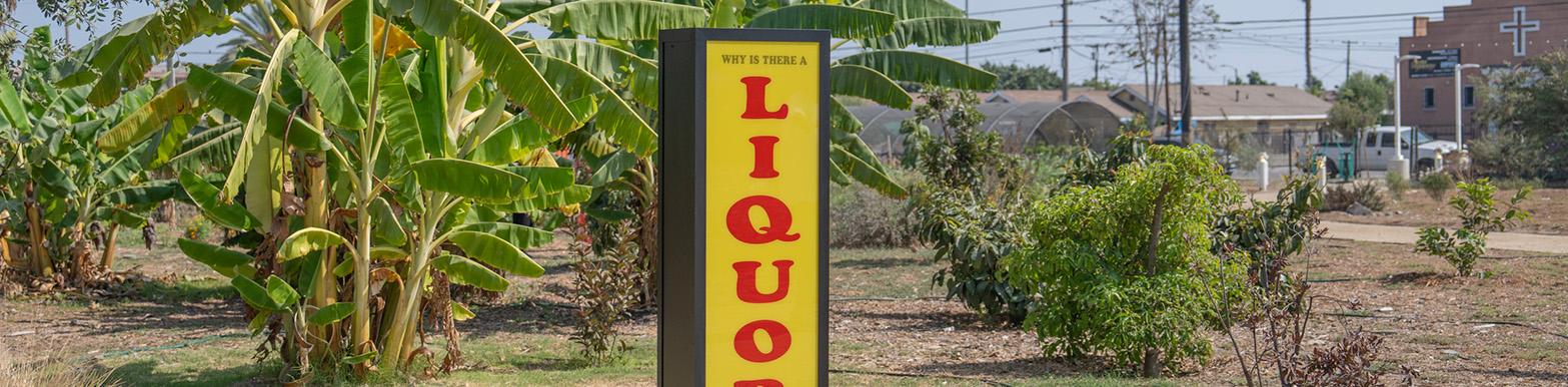 Terrick Gutierrez’ Why Is There A Liquor Store on Almost Every Corner? is a six feet high freestanding liquor store sign. The installation is an extension of his liquor store series on paper that addresses critical issues including food insecurity, discriminatory land use, zoning practices, and the pervasive presence of nuisance businesses.