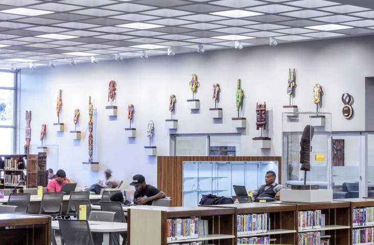In 1984, to commemorate the Olympics being held in Los Angeles, Emile Jordan put on display five sports themed plaques, ten sculptures, and fourteen masks, all hand carved, at the AC Bilbrew Library. Jordan’s masks and statues are inspired by historic African tribal motifs, but his contemporary interpretation makes them seem timeless. The artworks were cultural landmarks for the different sections of the library for almost 30 years. Since the artworks became beloved and iconic fixtures, Jordan donated them to the library so they will continue to remain on public display. In 2016-17, the library was renovated and the artworks were custom mounted and encased throughout the public space, giving them more prominence as an important part of A.C. Bilbrew Library history.