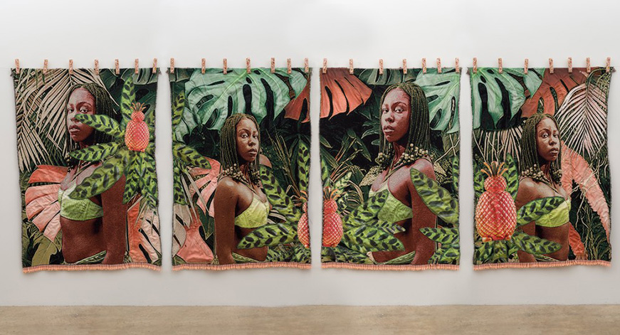 (Photo Credit)April Bey. I KNOW ALL ABOUT WHAT YOU WANT TO KNOW ALL ABOUT, 2024. Jacquard, sherpa, crushed velour, metallic thread, beads, adorned clothespins. 4 Panels: 80 x 240 inches overall. Courtesy of the artist and Vielmetter Los Angeles. Photo credit: Jeff McLane.